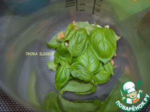 • Для соуса песто из базилика можно использовать готовый. Я же приготовила его сама, так как свежий базилик у меня растёт на окошке. Кедровые орехи обжарить на сковороде без жира до золотисто-коричневого цвета. Натереть мелко пармезан. Нарезать крупно чеснок. Листья базилика оторвать от стеблей и нарезать крупно.