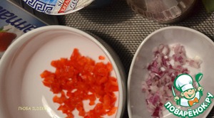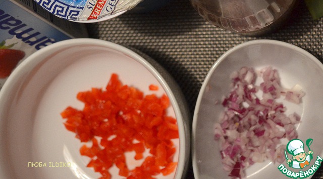 • Очистить перец и лук. Порезать на очень мелкие кубики. Смешать обе смеси и заправить уксусом и маслом, приправить солью и молотым перцем.