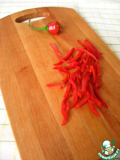 Перец чили нарезать полукольцами, освободив предварительно от семян.