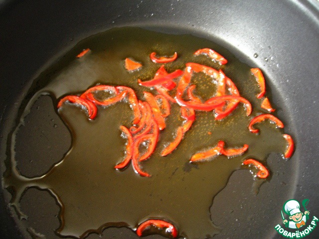 На сковороде с толстым дном разогреть оливковое масло. В масло выложить чили и обжарить в течении 3минут.