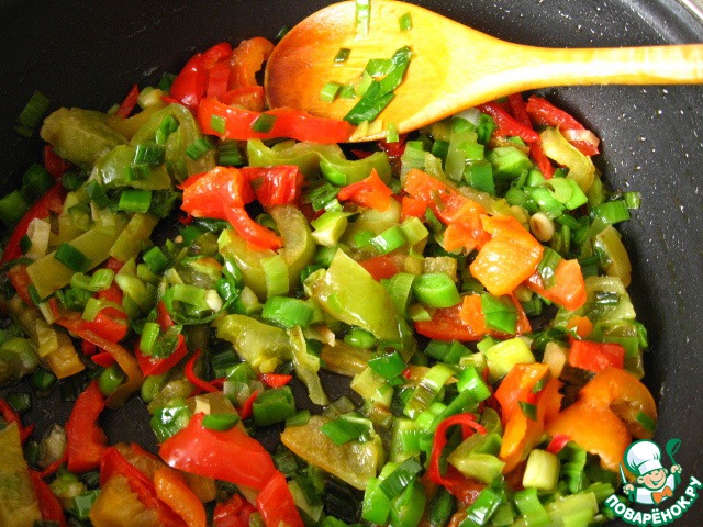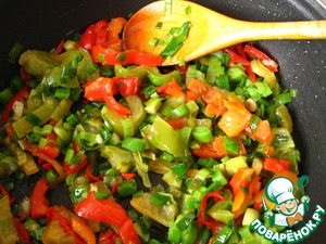 Добавить в сковороду нарезанный тонкими полосками болгарский перец.