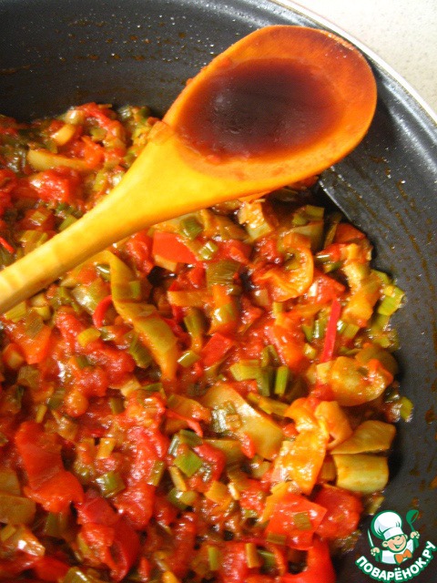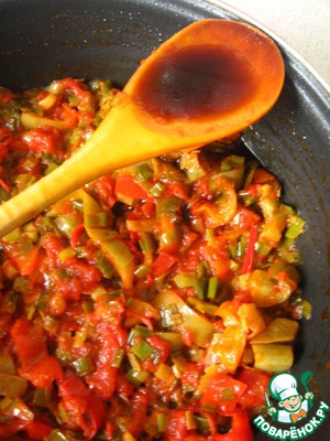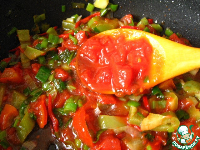 Зимой на помощь приходит готовая нарезанная мякоть помидоров. Взять её 4ст. л. Добавить в сковороду, перемешать и готовить с приоткрытой крышкой на среднем огне до мягкости овощей. Постараться выпарить всю жидкость. -