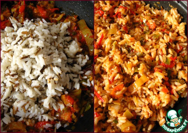 Выложить готовый рис и тщательно всё перемешать. Досолить, поперчить по вкусу.