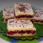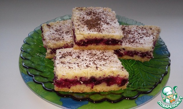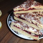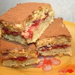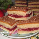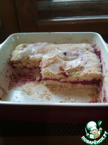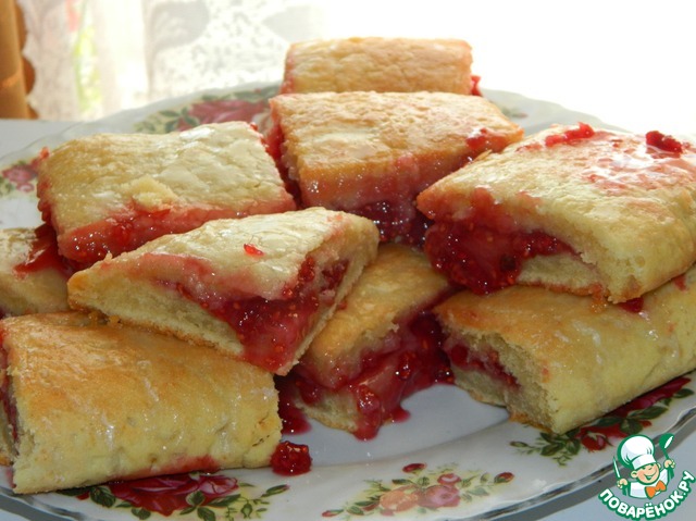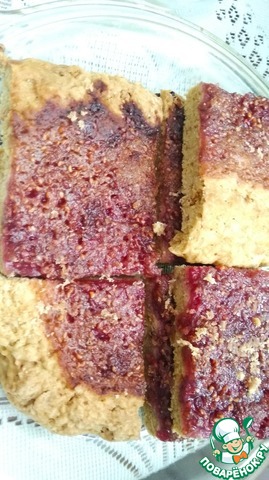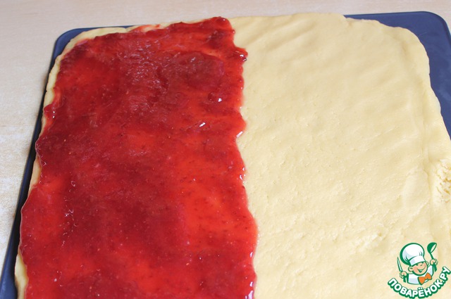 [+4]Раскатав тесто на противне, намазала половинку малиновым вареньем, пыталась поднять вторую половинку теста и накрыть им, но ничего не получилось. Тесто не хотело отлипать от противня. Тогда я взала варенье и размазала его по всему тесту, сделав небольшие бортики.