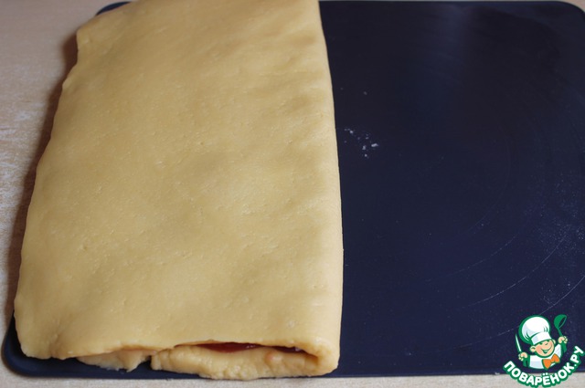 Готовое тесто раскатаем в пласт, толщиной 1см. Лучше на коврик или на бумагу сразу.