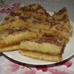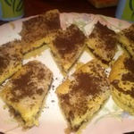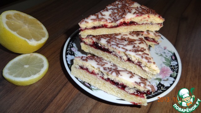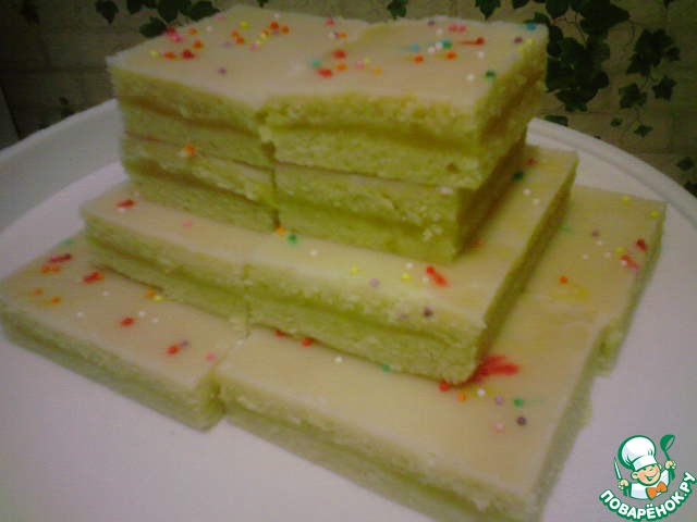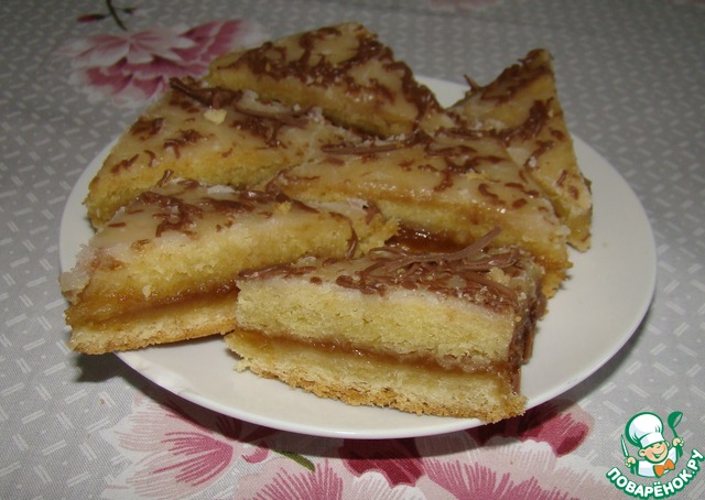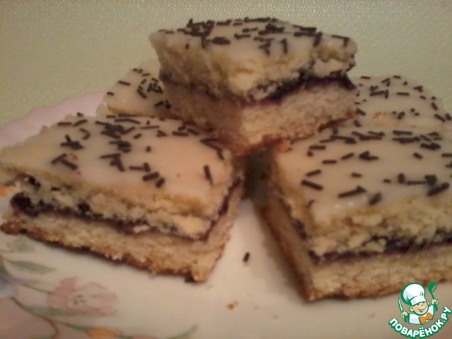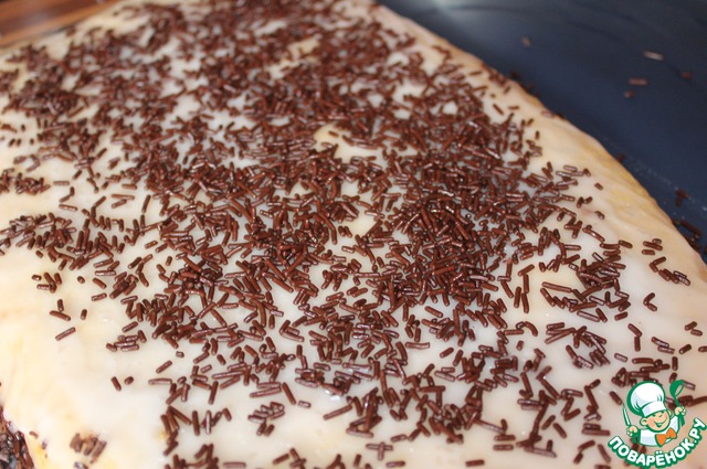 Готовый пирог поливаем глазурью. Для этого разведем сахарную пудру с 2 ложками воды. Сверху я посыпала шоколадом. Нарезаем на квадраты, ромбы и подаем к столу! Приятного чаяпития!