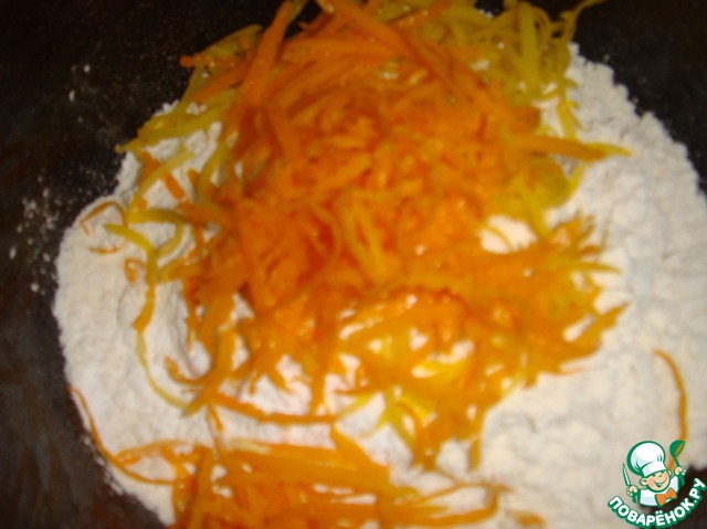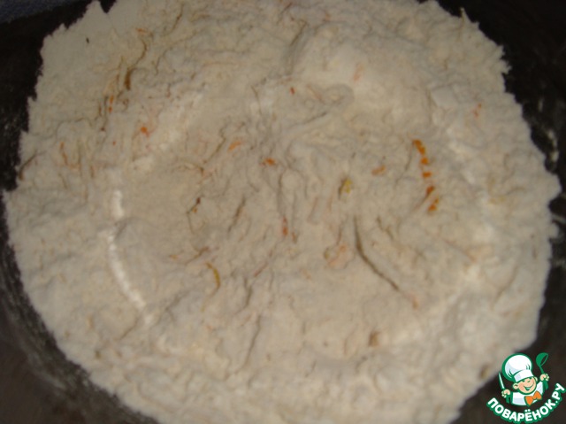 • Просеять в миску муку, разрыхлитель и соль. Добавить лимонную и апельсиновую цедру