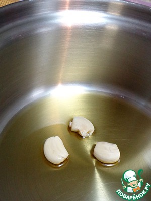• В посуде с толстым дном разогреть оливковое масло, обжарить чеснок до золотистого цвета, удалить.