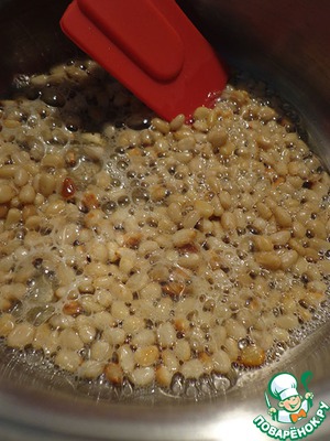 • Добавляем орехи, обжариваем до золотистого цвета 1-2 минуты.