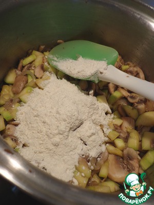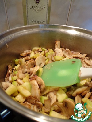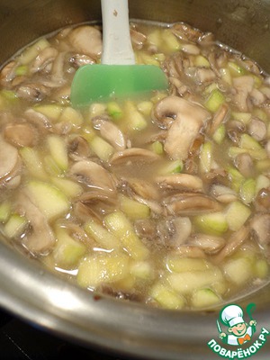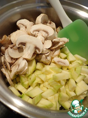 Добавить грибы и цукини, перемешать. Готовим 2-3 минуты, пока из овощей не выпарится вся жидкость.