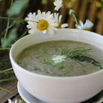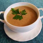 Пюрировать блендером. Влить сливки, вернуть на плиту и довести до кипения. Украсить зеленью петрушки.