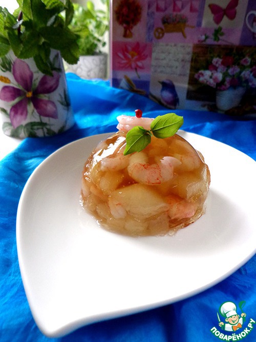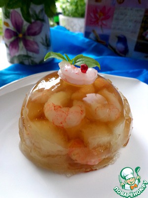Выложить слой креветок, сверху залить немного желе. Снова убрать в холодильник.