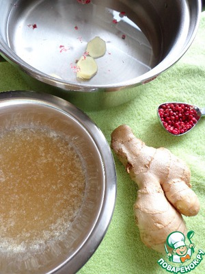 Желатин залить 100 мл воды. Остальную воду наливаем в кастрюльку, добавляем кусочек имбиря и слегка раздавленный розовый перец, соль.