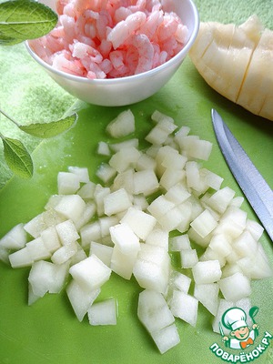 Дыню очистить и нарезать небольшими кубиками. Креветки у меня варено-мороженые, их предварительно разморозила в холодильнике. Если у вас сырые, то соответственно отварить.