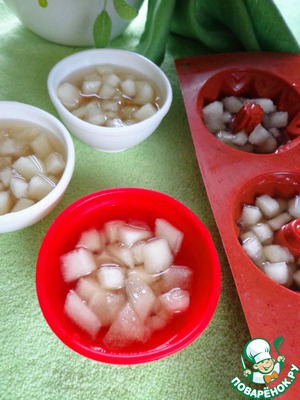 Дальше слой дыни, желе и снова в холодильник. Таким образом заполняем формочки до конца и убираем заливное в холодильник до полного застывания.