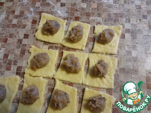 За это время наше тесто поднялось в три раза. Берём тесто не очень большими порциями, чтобы удобно было раскатывать. Раскатаем до толщины примерно 2 мм. и разрежем на квадратики 4х4 см. В середину положим по 1 ч. л. каштановой начинки.