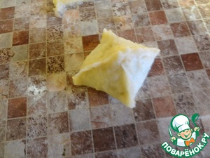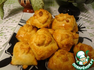 Защипываем пышки так, как показано на фото. Кладём их на противень швом вниз, даём немного подняться. Смазываем их яичным желтком разведённым 1 ст. л. молока. Ставим в духовку при темп. 200 гр. С на 20-25 мин. пока они не станут золотистыми.