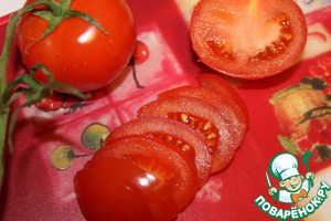 Помидоры вымыть и разрезать пополам и нарезать ломтиками.