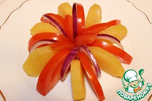 Теперь выкладываем салат на тарелку украшаем полосками красного лука. На самом деле готовится все гораздо проще надо просто перемешать все ингредиенты, заправить маслом, уксусом и специями.