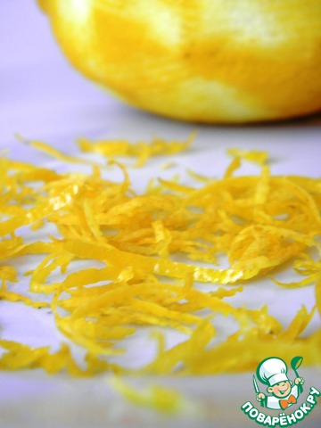 Лимон обдайте кипятком, обсушите салфеткой и снимите с него цедру – только желтую часть! Нарежьте цедру тонкой «лапшичкой». Я делаю проще: натираю цедру с помощью терки для корейской моркови))) Выжмите из лимона сок в мерную емкость. Долейте воды, чтобы в общем объеме получить 100мл. Цедру и сок лимона положите в отдельную кастрюльку или ковш, добавьте оставшийся сахар. Готовьте на среднем огне 12-15мин, пока сироп не уварится до 1/3 от всего объема. Снимите с конфорки и остудите.