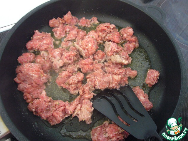На разогретую сковороду с оливковым маслом выложим фарш и обжарим, помешивая время от времени.