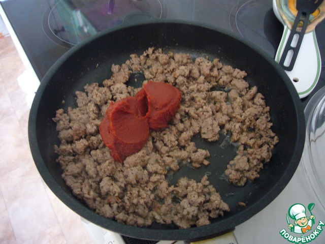 Когда фарш слегка подрумянится, добавим томатную пасту. Хорошо перемешаем и потушим под крышкой, периодически помешивая, до полной готовности около 10-15 минут.