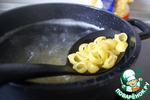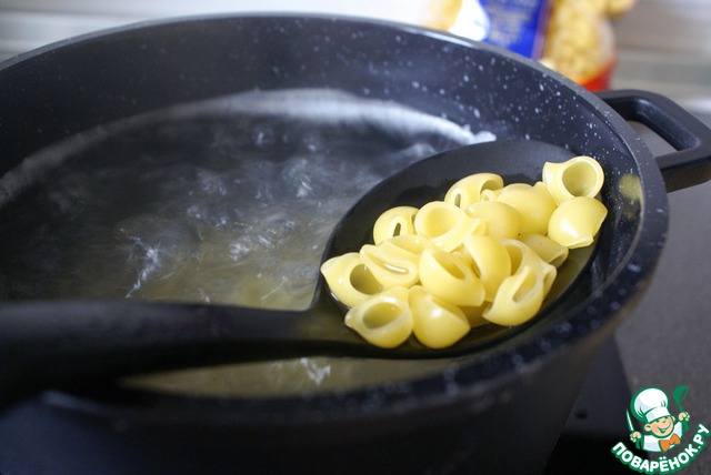 Опустить макаронные изделия в кипящую подсоленную воду и варить до состояния аль-денте.