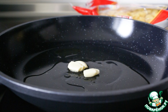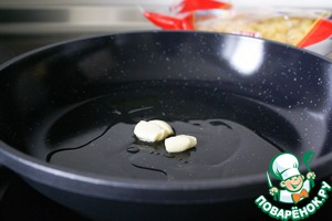 На хорошо разогретой сковороде в небольшом количестве оливкового масла подрумянить чеснок до появления характерного запаха. После чего, чеснок извлечь.