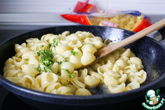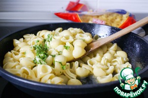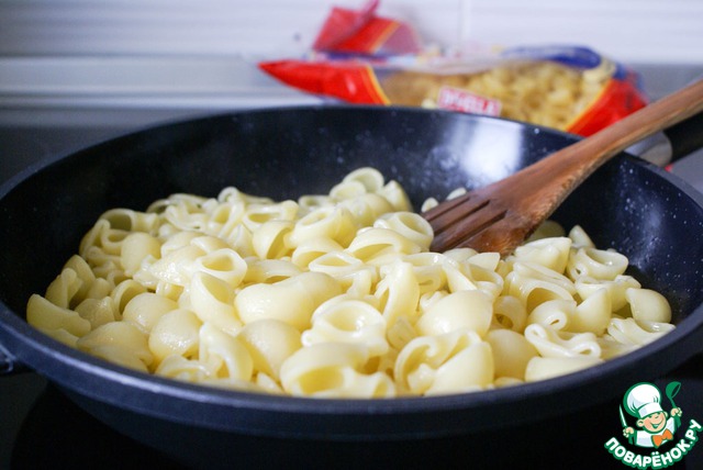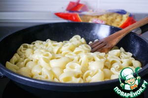 Отваренные макаронные изделия откинуть на дуршлаг и выложить в сковороду. Прогреть вместе с маслом на сковороде в течение нескольких минут так, чтобы макароны "напитались" маслом. Выключить огонь.