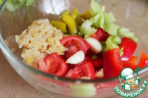 Поскольку всё будет измельчаться блендером, то овощи немного нарезать: сельдерей, лук (можно зелёный), чеснок очищенный, помидор и перец болгарский.