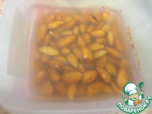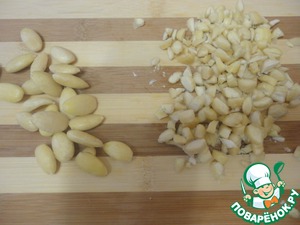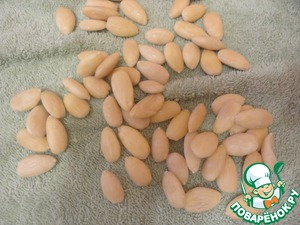 Тесто разморозить согласно инструкции. Миндаль залить кипятком на пару минут.