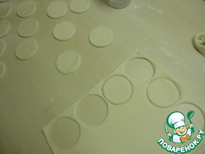 Раскатать тесто в одном направлении. Вырезать стаканчиком по 12 кружочков, с каждого пласта, диаметром 6 см. Всего 24 кружочка. Обрезки аккруратно разложите, они нам ещё пригодятся!!