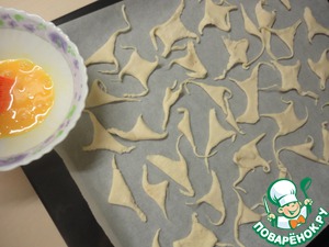 Тем временем займёмся обрезками теста. Включаем духовку на 200гр. Разложить на листе пергамента кусочки теста. Взбить желток с 1 ч. л. воды и смазать каждый кусочек.