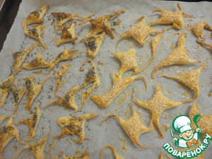 Сверху посыпать кунжутом и маком (вариант для детей). Можно сделать пикантные слоечки если посыпать их морской солью, травами и тмином (вариант для взрослых).