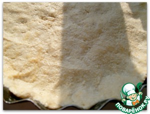 Готовим тесто. Смешиваем творог, яйца, соль, муку и разрыхлитель. Довольно эластичное тесто легко формируется. В смазанной форме делаем основу - поднимаем бортики для пирога.