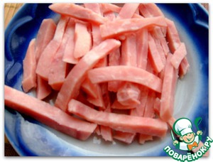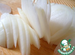 Лук нарезаем пластинками. Если он горчит - обдаем кипятком и промываем в холодной воде.