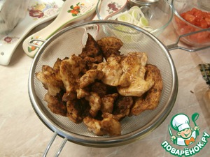 Откинуть на дуршлаг, чтобы стекло лишнее масло.