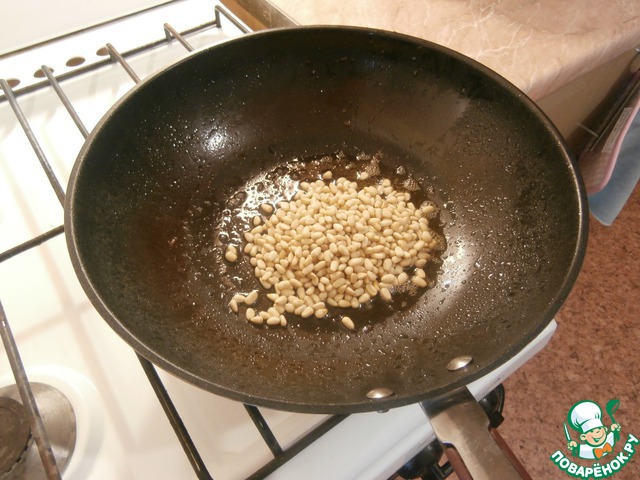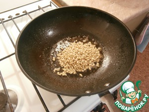В масле, оставшемся от жаренья курицы, слегка обжарить кедровые орехи,