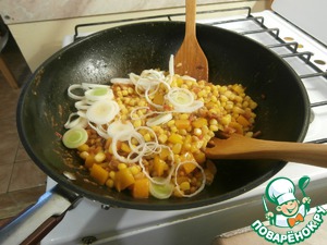 Затем добавить болгарский перец, помидор, консервированную кукурузу и лук-порей,