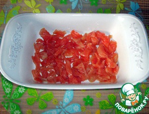 Свежесолёный лосось нарезать на маленькие кубики. Форму смазать маслом и положить на дно лосось.