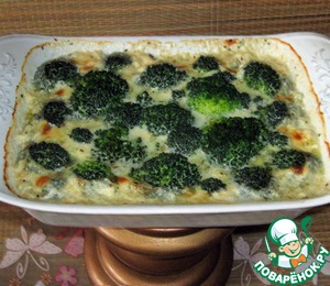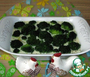 ( Брокколи разъедить и на 3 - 5 минут положить в кипящую воду. Затем поставить под проточную воду и дать стечь воде ). Выложить брокколи сверху смеси и поставить запекать в духовку при температуре 200 градусов.