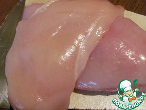 Возьмём филе и нарежем отбивные на всю длину. У меня красивых получилось 4 штуки. Остальное оставшееся мясо можете использовать по своему усмотрению. Отбивные солим и перчим с двух сторон и немного отбить (чуть-чуть-куриное мясо очень нежное).