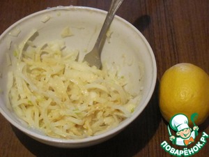 Лук нарежем полу-полукольцами и хорошо вилкой или деревянной толкушкой его подавим, чтоб вышло немного сока (я давила толкушкой обычной). Туда добавим горчицу и лимон (выдавить немного сока, а остальное порезать не крупно и в маринад). Всё перемешали и наши косички обложили со всех сторон маринадом. Пусть пропитаются всеми соками 30-40 мин.