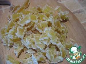 Соединить нарезанный имбирь, финики и вымытый, обсушенный изюм и все это присыпать слегка мукой.