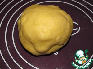 Замесить песочное тесто. Для этого муку смешать с разрыхлителем, высыпать на разделочную доску. Сделать в муке воронку, всыпать 1 ст. л сахара и соль, добавить размягченное масло, порезанное на кусочки и желток. Вымешивать тесто, немного подливая воду, до тех пор, чтобы тесто легко отлипало от рук. Скатать тесто в шар, завернуть в пленку и поместить в холодильник на 1 час.