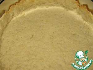 Раскатать песочное тесто в тонкий пласт на столе, присыпанном мукой. Выложить пласт теста в форму, сделать бортики и поставить в разогретую до 210 С духовку на 10 минут.