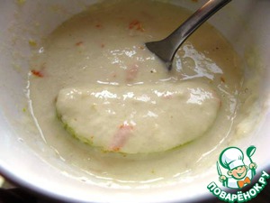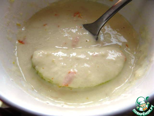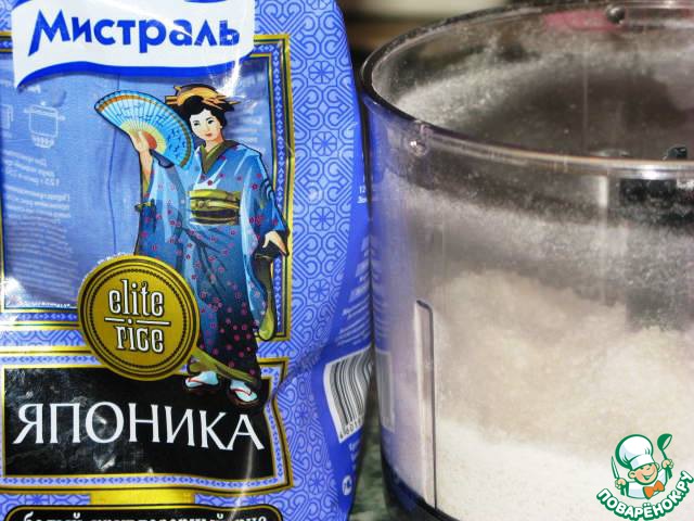 • Делаем кляр. Смешиваем молотый рис, муку, соль, цедру апельсина и воду.