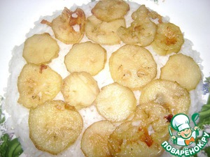 Баклажан нарезать кольцами, обжарить на подсолнечном масле. На плоскую тарелку выкладываем рис, утрамбовываем его рукой. Для закуски я выбрала форму круга. На рис выкладываем баклажаны.