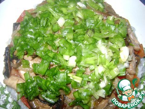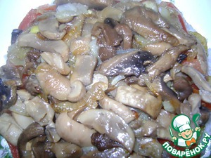 Затем грибы с луком. При этом закуску утрамбовываем рукой.
