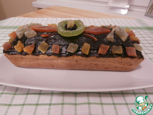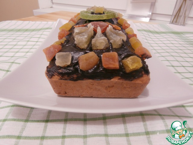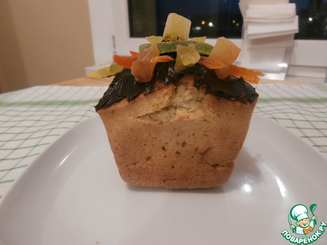 Растопить на водяной бане шоколад, полить кекс, украсить цукатами, веточкой мяты. Цукаты и крупную стружку шоколада можно добавить при замесе в тесто.
